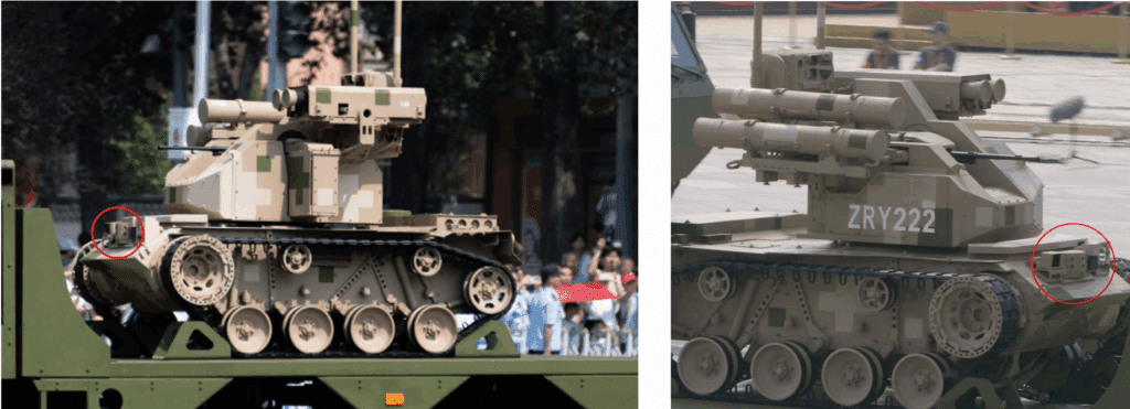 The parade included multiple tracked unmanned ground platforms, many visibly armed with rocket pods or heavy machine guns. These unmanned systems, likely integrated with LiDAR for navigation and targeting purposes, included heavily armed tracked platforms likely designed for anti-tank warfare and other systems intended to work in concert with unmanned aerial vehicles and dismounted infantry in smaller-scale engagements. The ZRY-222 stands out as a newly introduced rocket and gun platform, featuring a LiDAR sensor under its main gun mount.
