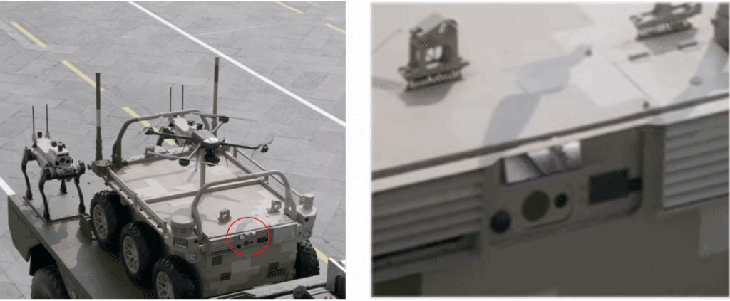 Beijing also highlighted a range of wheeled platforms for infantry support and autonomous logistics. Some of these appear equipped with Hesai AT512 LiDAR units, enabling off-road autonomy, while an upgraded Type 08 infantry fighting vehicle carried Leishen CH64W sensors. The significance of these vehicles lies not only in their autonomy but in their modularity: the smaller platforms can carry quadcopter drones into battle, creating a “system of systems” approach in which ground robots launch aerial scouts for reconnaissance or targeting. The Type 08 upgrade, meanwhile, demonstrates how China is layering autonomy onto legacy platforms to extend their battlefield relevance.